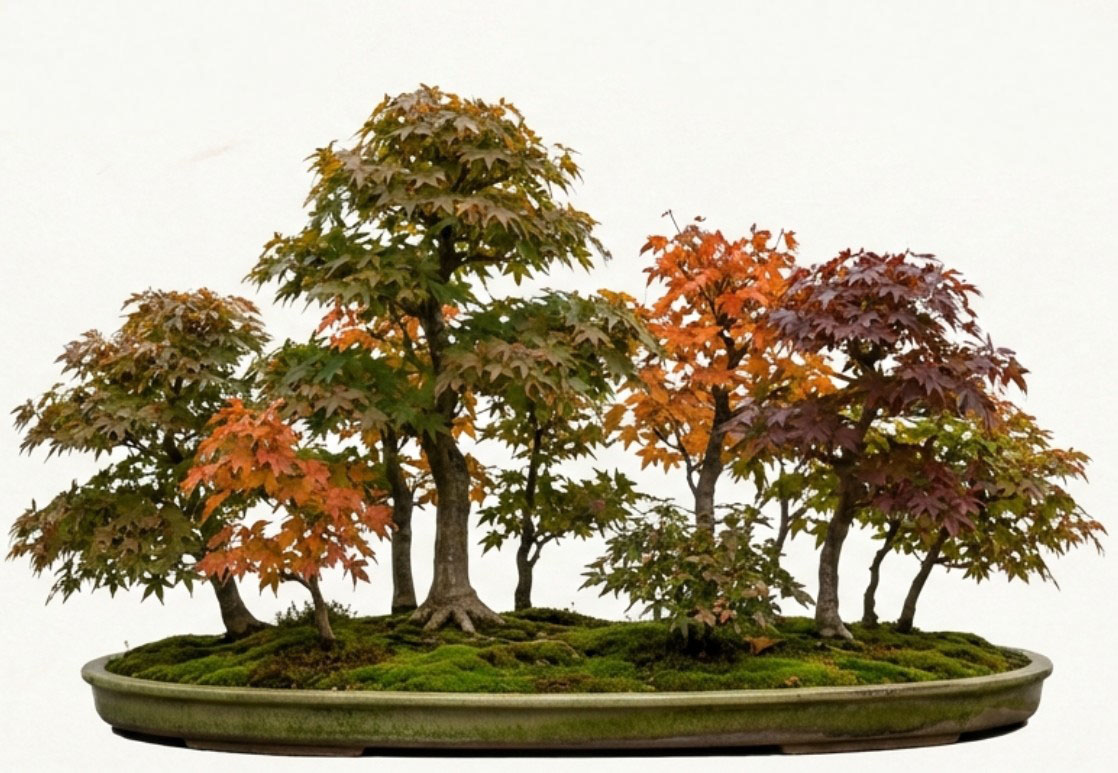 A Yose-ue stílus során több, általában páratlan számú fát ültetünk egyetlen lapos tálba, hogy egy miniatűr erdő vagy liget illúzióját keltsük. A japán juharok különböző méretei és változatos őszi színei miatt ez az egyik leglátványosabb módja a juharbonsaiok bemutatásának, amely a békét és a természet harmóniáját sugározza.